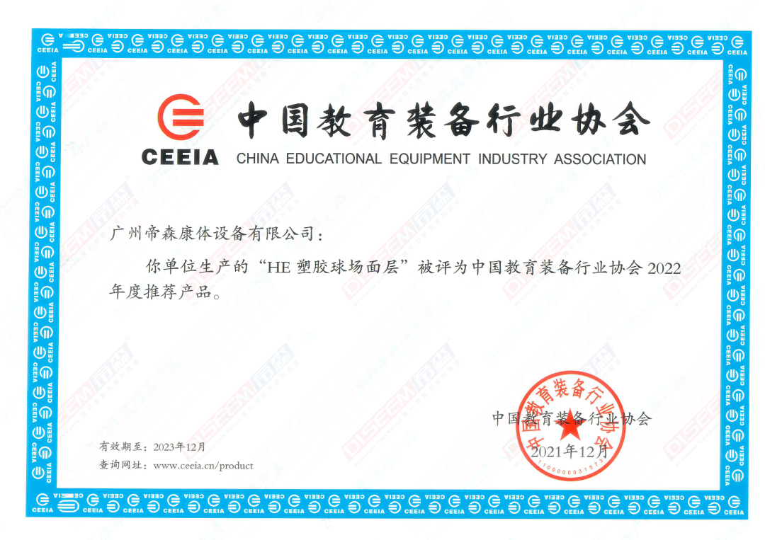 2017年帝森與深圳建筑工務(wù)署簽訂戰(zhàn)略合作協(xié)議框架,作為深圳市政及教育系統(tǒng)指定運(yùn)動(dòng)面層材料供應(yīng)商。2018年帝森溶劑塑膠跑道獲得中國教育裝備行業(yè)協(xié)會(huì)頒發(fā)的2018年度金獎(jiǎng)產(chǎn)品。2019年與濟(jì)南市體育局簽訂戰(zhàn)略合作協(xié)議;2021年12月,就在前天帝森“HE高彈性塑膠跑道面層”獲得中國教育裝備行業(yè)協(xié)會(huì)2022年度推薦產(chǎn)品。