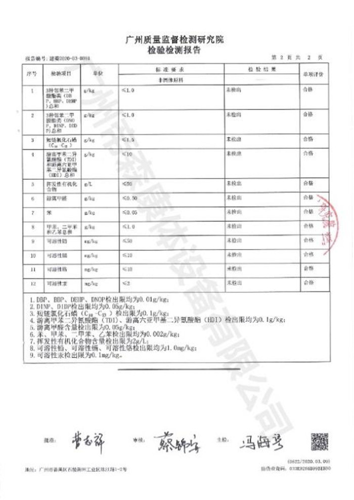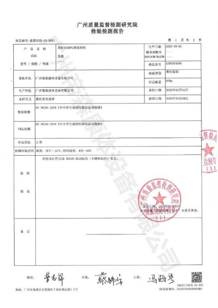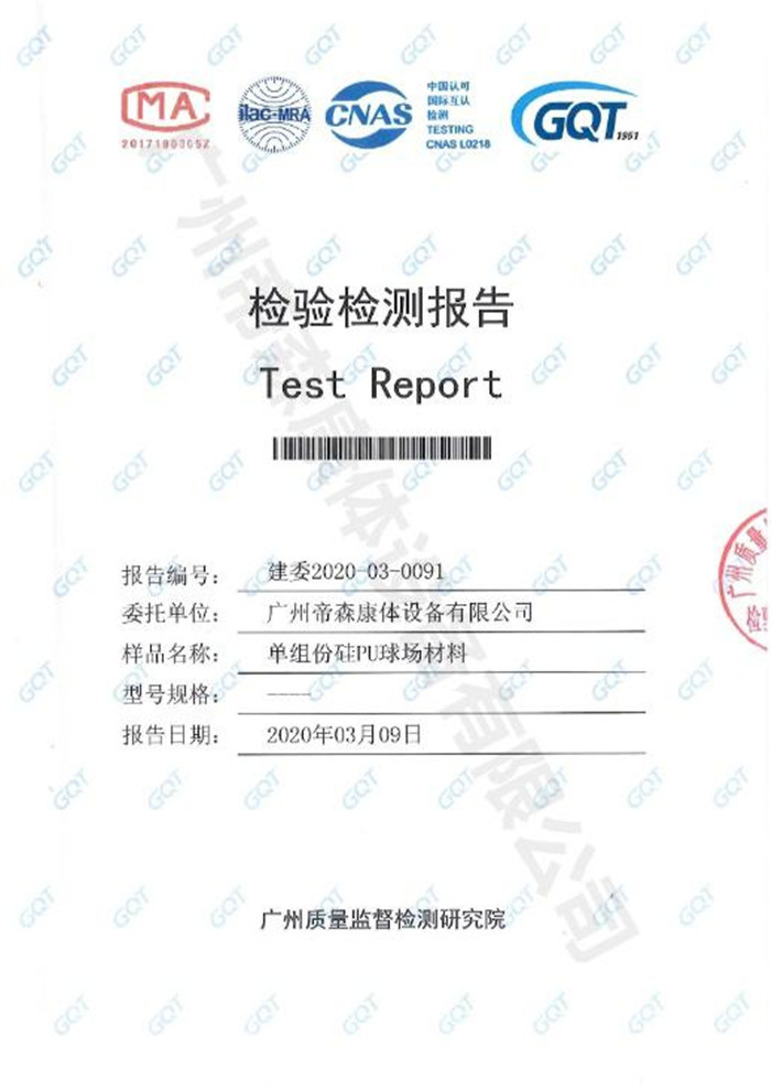 廣州帝森DISEN單組份硅PU球場材料通過了GB36246-2018《中小學合成材料面層運動場地》最新國家標準檢測,有害物質含量檢測項目均顯示:未檢出!真正做到材料綠色環(huán)保,無毒無刺激氣味。