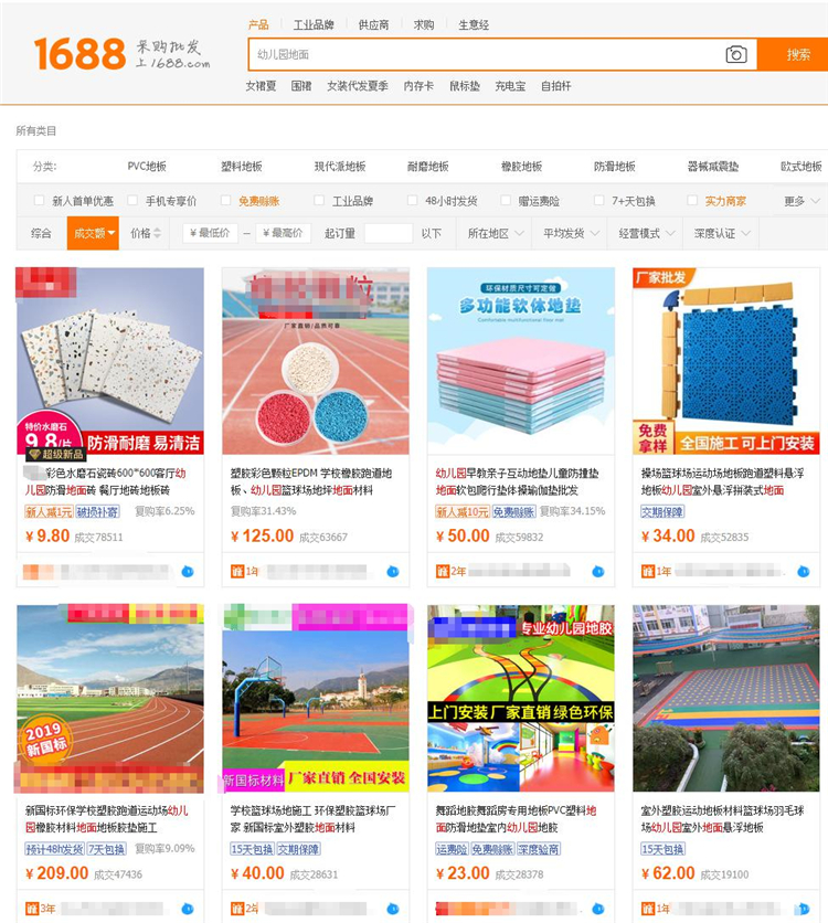 通過在電商平臺(tái)搜索幼兒園地面,可以看到排在前列的產(chǎn)品主要有瓷磚、塑膠跑道球場(chǎng)、爬行墊、PVC塑膠地板以及懸浮式拼裝地板等。