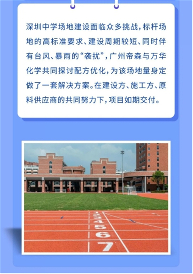 近日,萬(wàn)華化學(xué)報(bào)道展示了廣州帝森DISEN與萬(wàn)華化學(xué)的共同技術(shù)成果——深圳中學(xué)項(xiàng)目,采用環(huán)保型優(yōu)質(zhì)運(yùn)動(dòng)地材,為建設(shè)綠色深中、打造“百年名?!?、爭(zhēng)創(chuàng)“魯班獎(jiǎng)”貢獻(xiàn)力量。
