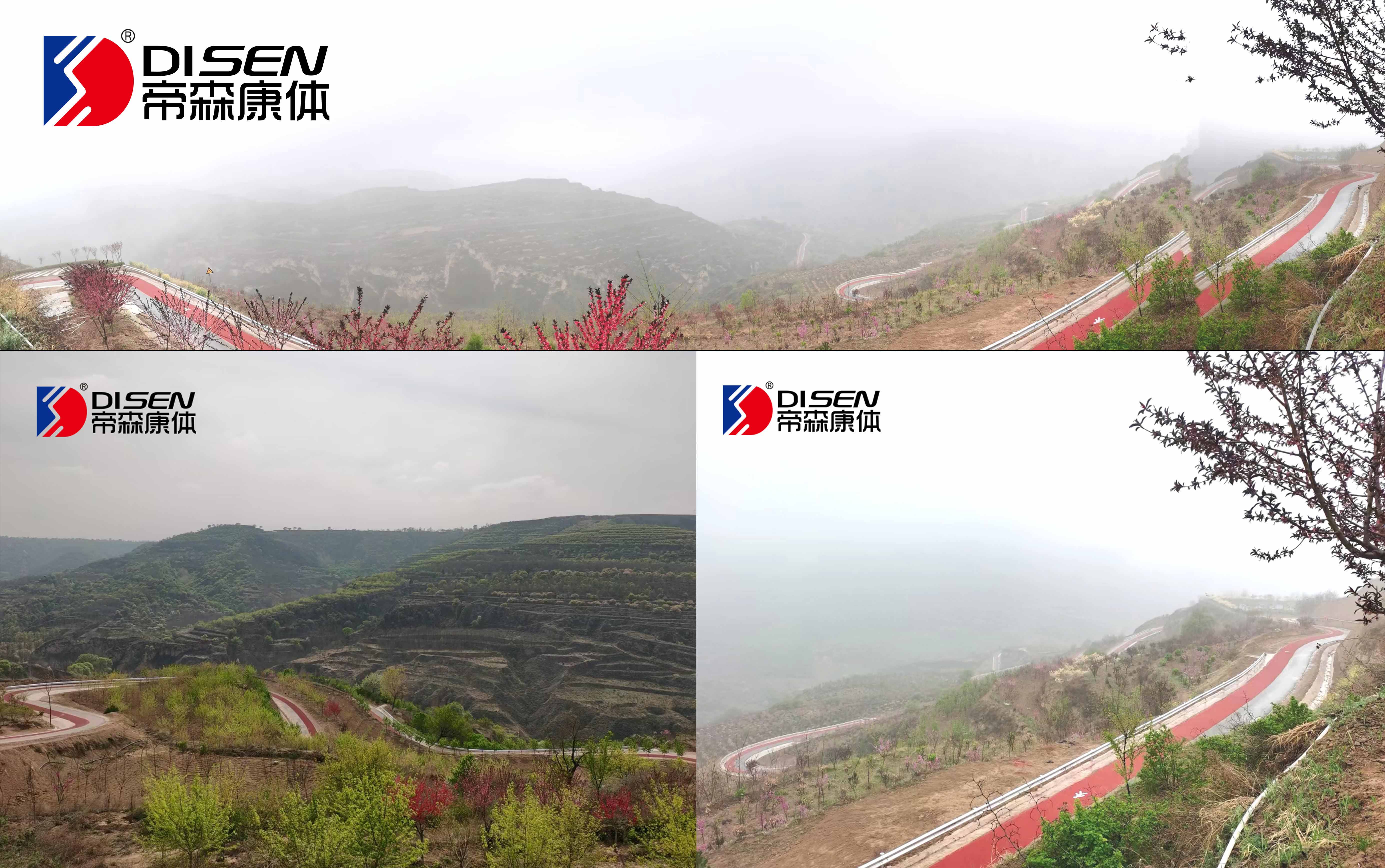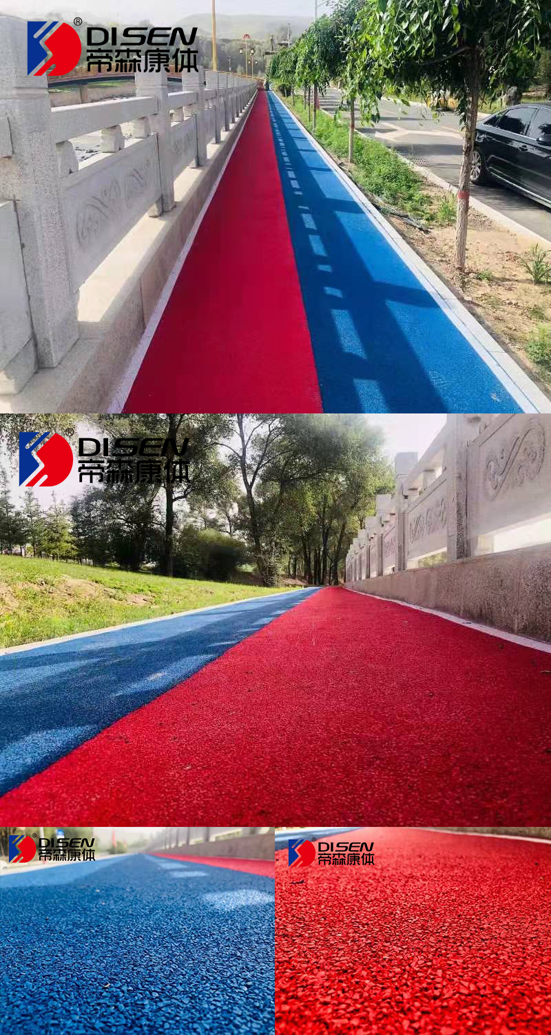 該健身步道占地4000㎡,采用廣州帝森牌單組份膠水II型及硅PU塑膠材料等系列材料,紅藍(lán)色調(diào),炫彩靚麗,蜿蜒向前延升,帶領(lǐng)著全民為健康而向前。