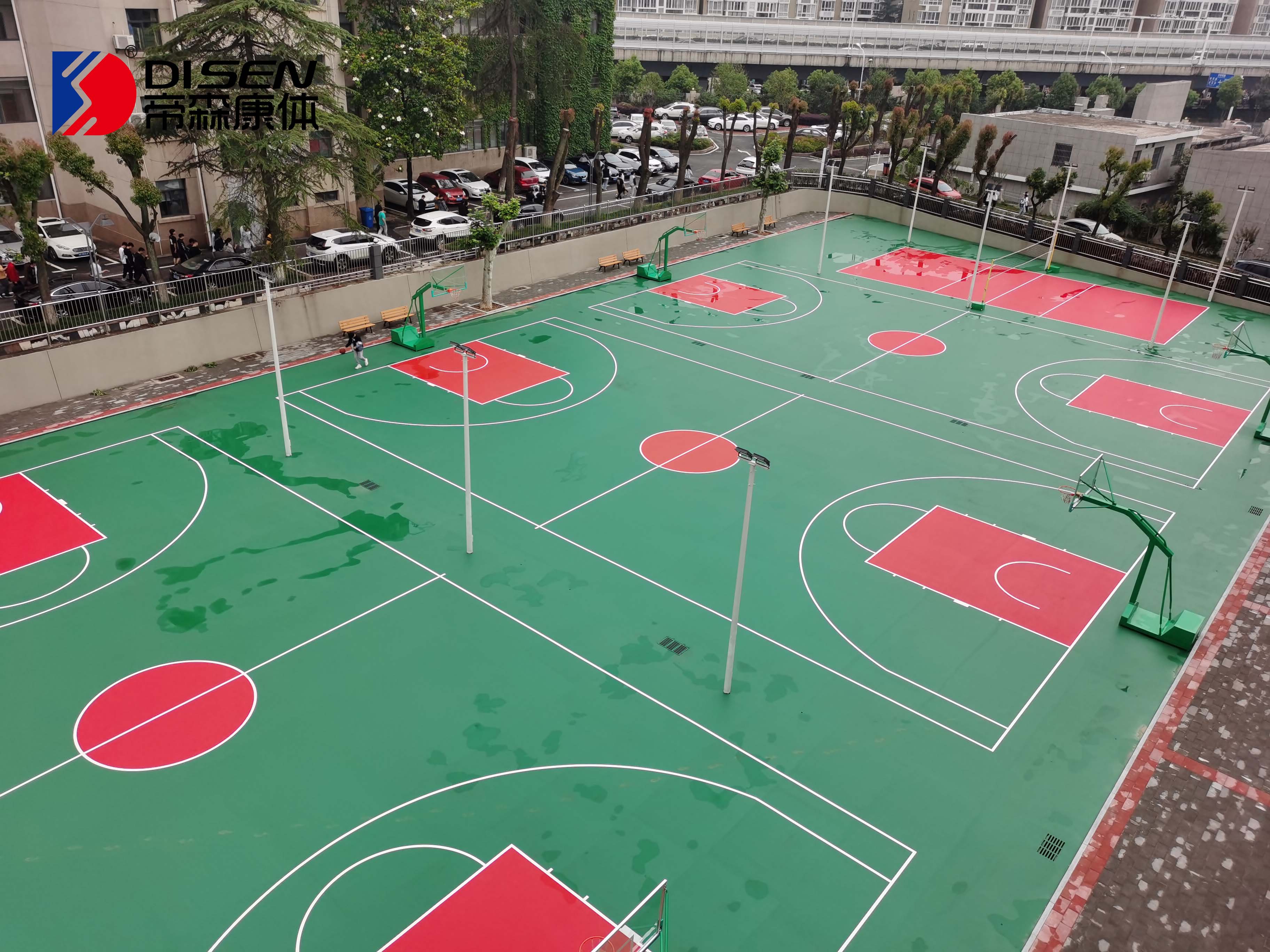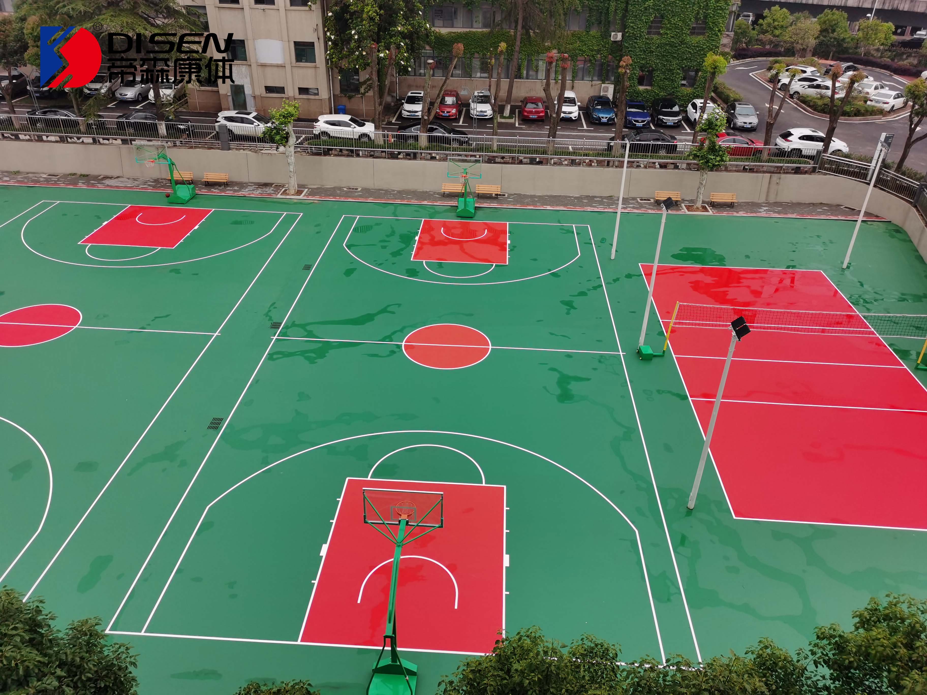 進(jìn)入校園,一片紅綠相間的塑膠(硅PU)球場映入眼簾。場地包含三個(gè)籃球場,一個(gè)排球場,采用的是廣州帝森DISEN單組份硅PU球場材料,更環(huán)保、安全、舒適、美觀,助力全體師生為健康而動。