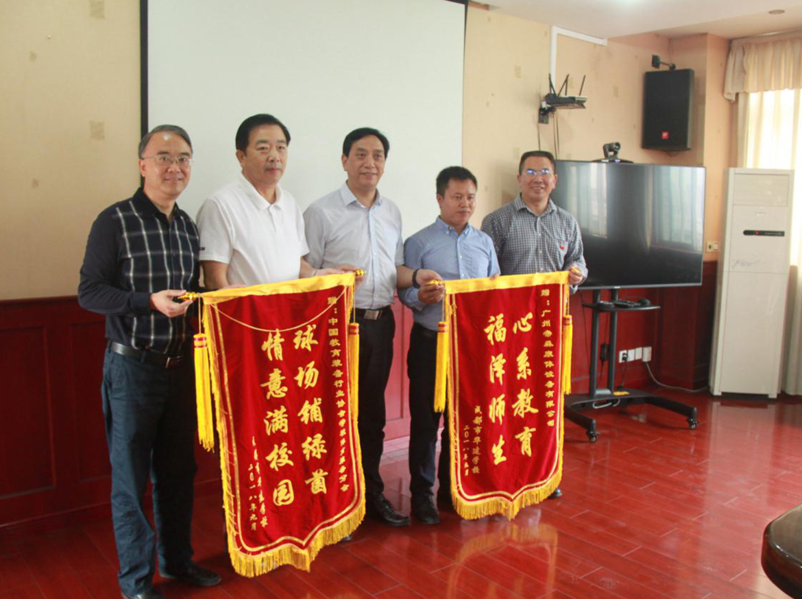 由中國(guó)教育裝備行業(yè)協(xié)會(huì)學(xué)校體育裝備分會(huì)組織,廣州帝森康體設(shè)備有限公司向中國(guó)教育發(fā)展基金會(huì)捐建四川省成都市華建學(xué)?;@球場(chǎng)地,校方為捐建企業(yè)廣州帝森贈(zèng)送錦旗致謝。